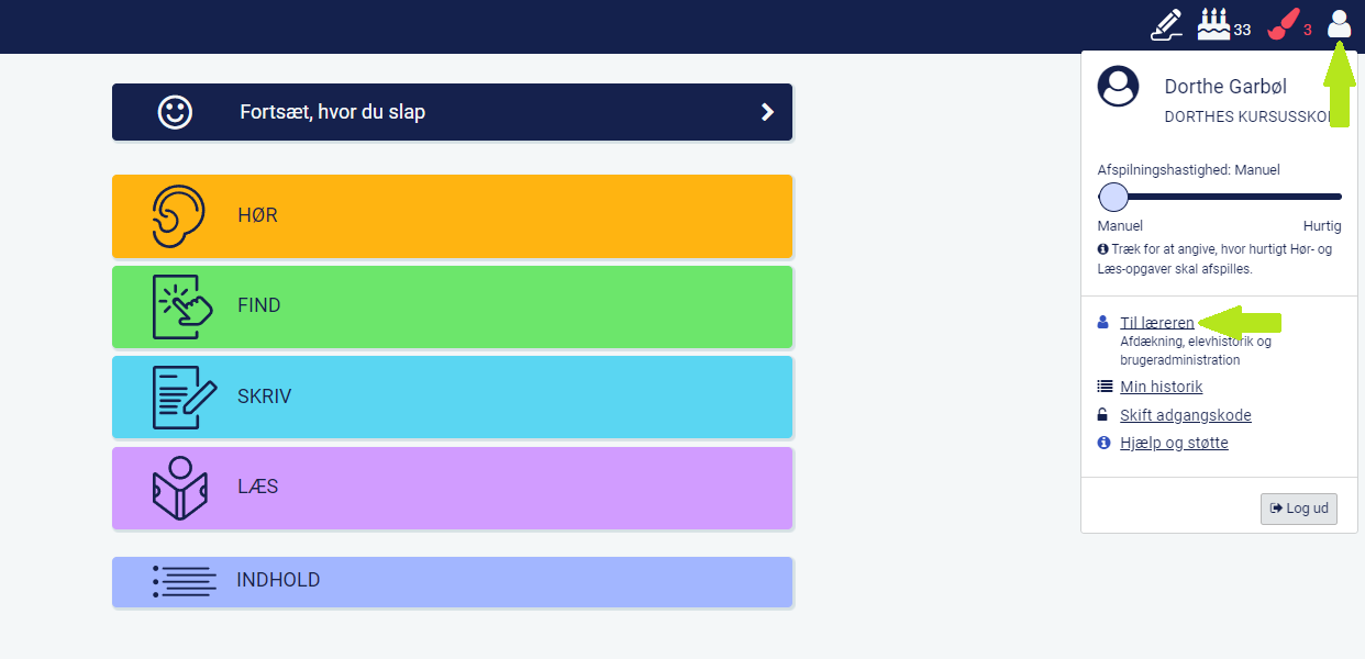 Log ind i Aski Raski, klik på brugerikonet øverst til højre og tryk derefter på "Til læreren" (billede 1).